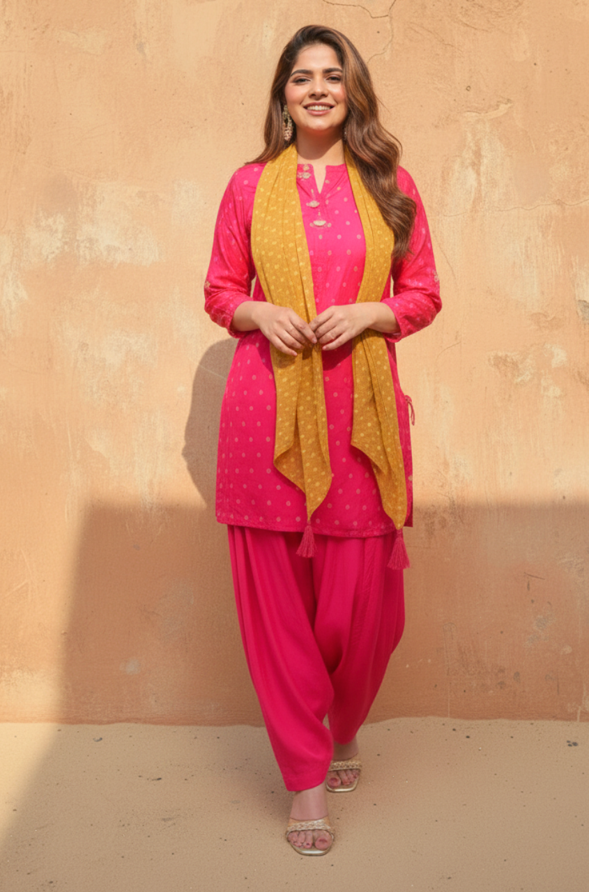 A vibrant hot pink jacquard kurta set paired with a matching Patiala pant and a mustard yellow stole. The intricate woven texture of the jacquard fabric lends a luxurious touch, while the bright contrasting tones add a playful festive charm. Designed for comfort with a flattering silhouette, this outfit blends traditional elegance with youthful energy. Perfect for mehendi ceremonies, festive brunches, or cheerful daytime gatherings. A feel-good piece that brings together colour, comfort, and effortless style.