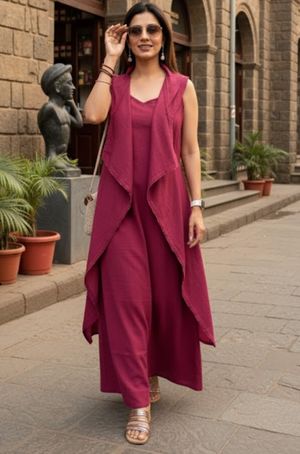Radiate elegance in this maroon ethnic ensemble, featuring a -A -line cut kurta with side slit adorned with delicate all-over motifs and intricate mirror and thread embroidery along the neckline....