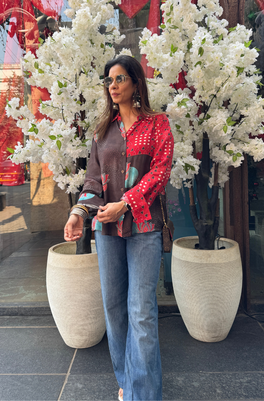 Make a bold style statement with this contemporary Lotus printed shirt, designed for effortless everyday elegance. Crafted in a rich earthy brown base, the shirt features an artistic mix of geometric and ajarakh prints, contrasted beautifully with a striking red patterned yoke and sleeves. The relaxed silhouette ensures comfort, while the button-down front adds versatility for styling.