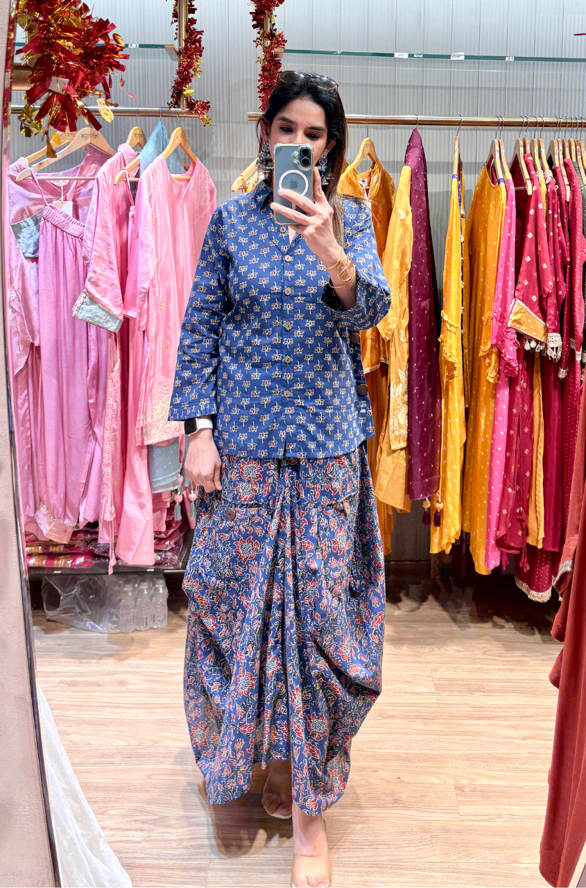 - ROZANA- Blue Printed Drape Skirt With Short Shirt