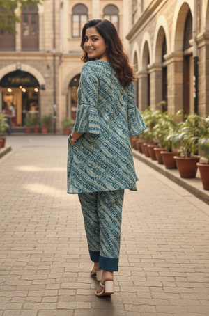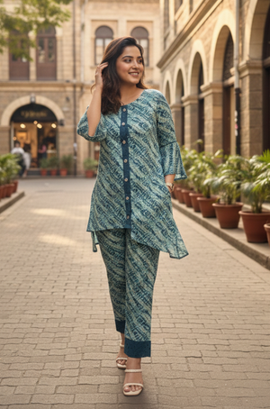 Step out in effortless elegance with this breezy teal printed co-ord set. The kurta features an asymmetrical hemline, three-quarter sleeves, and a contrasting button-down placket that adds a touch of...