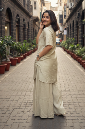 Elevate your everyday style with this elegant Grey co-ord set, designed for effortless sophistication. The set features a straight-fit kurta with a subtle sheen, a mandarin neckline, and a classic...
