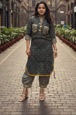 The blue Jumpsuit set features a dhoti jumpsuit, combining comfort with style in this chic fusion piece. The jacket, crafted from modal fabric with statement stripes pattern enhances the entire...