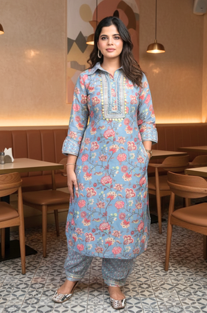 Pacific Blue modal silk : This is a summer friendly 3 piece suit set in the soul pleasing shade of blue. Having a neckline enhanced with scallop lace, it's enhanced...