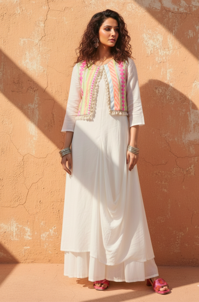 This ensemble features a pure mul gown with an asymmetrical cowl pattern, paired with a neon weave jacket adorned with shells and fringes. A flawless fusion of modern style and timeless elegance, it’s a standout statement piece