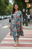 This co-ord set in a ocean blue floral print is perfect for making a stylish statement. The top features a flattering V neckline and peek-a-boo lacework detailing on the sleeves for added elegance. With a flowy silhouette, convenient pockets, and a princess cut, this set ensures a graceful and comfortable fit. Ideal for both casual and semi-formal occasions, it seamlessly blends charm and functionality.
