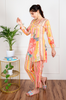 Its time to fall for this unique multi colored co-ord set which is designed in a beautiful stripe design along with the pants. The top is enhanced with an amalgamation of attention-worthy portions having lovely big floral print + hakoba work along with the sleeves! Its paired up with the premium style pant bringing the newness having its side panel created with our signature hakoba work enriched by the intricate lace !